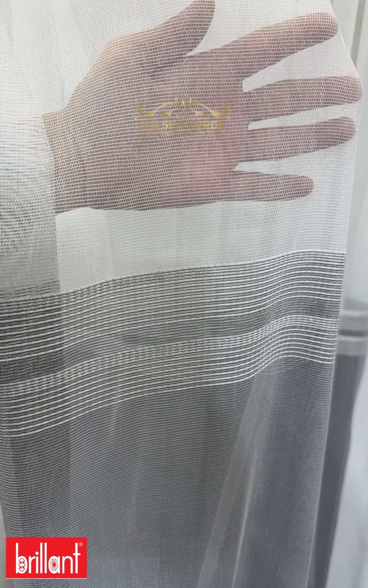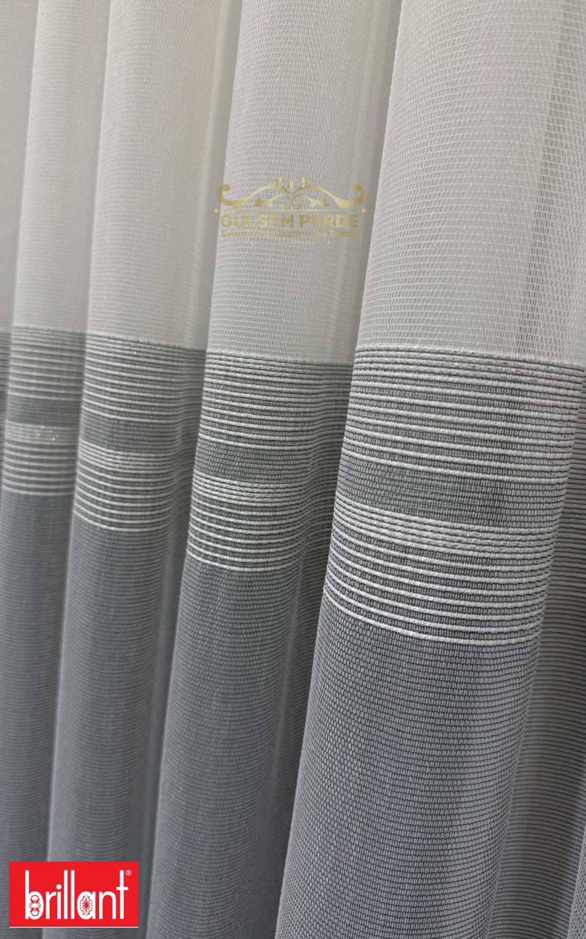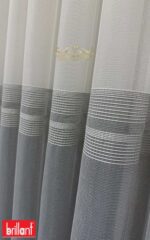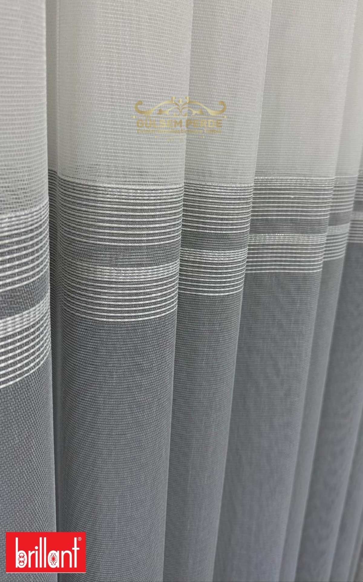 Sade tül üzerine eklenen antrasit şerit, perdeye derinlik katar ve özellikle gri, siyah, vizon ve açık tonlu dekorasyonlarla mükemmel uyum sağlar.
