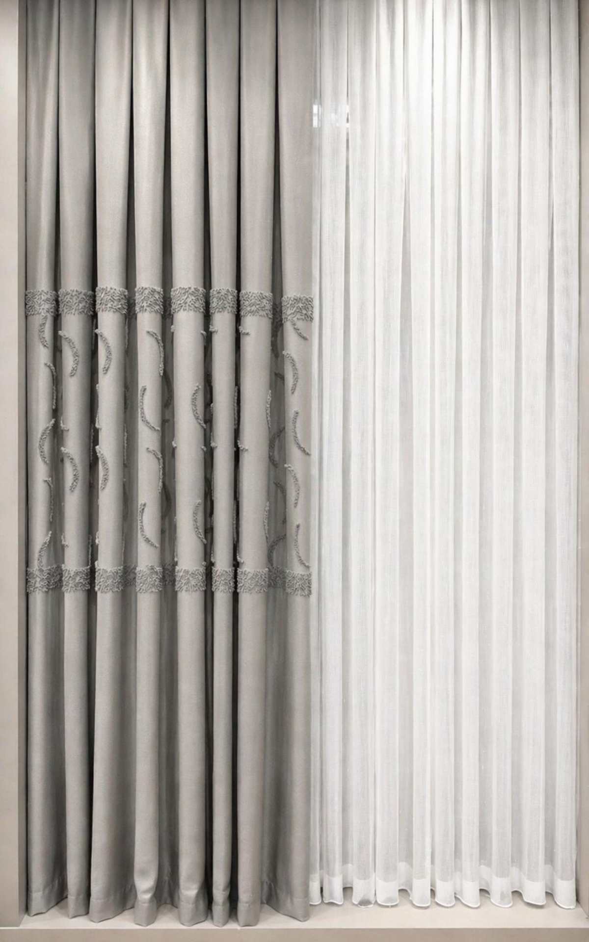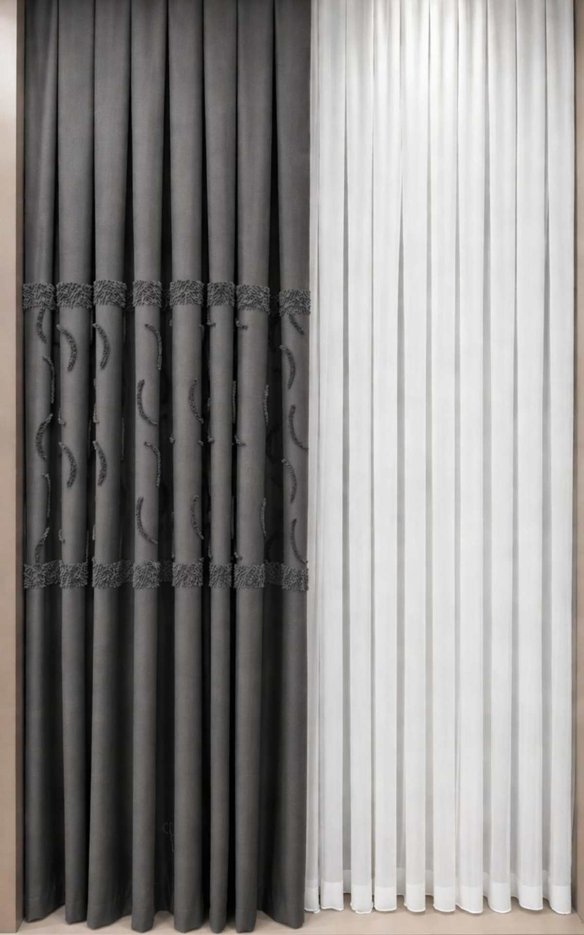 Orta kısmında yer alan özel desenli göbek detayı ve alt bölümdeki sakallı / şönil geçişli tasarım, perdeye hareket ve derinlik kazandırır.